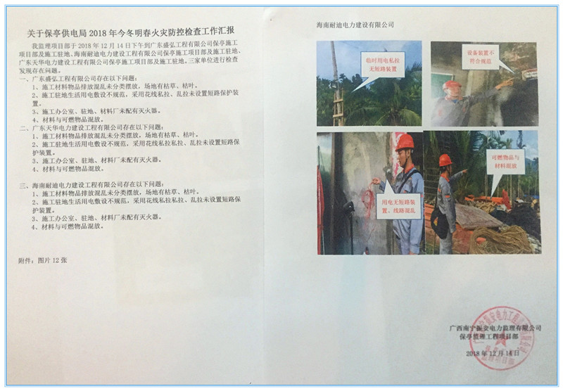 2018年12月10日,保亭供电局建管中心王录春主任在基建微信群要求监理单位组织,各施工单位配合,开展在建项目工程火灾隐患排查和整改,监理单位负责于12月20日前将开展工作情况上报建管中心。