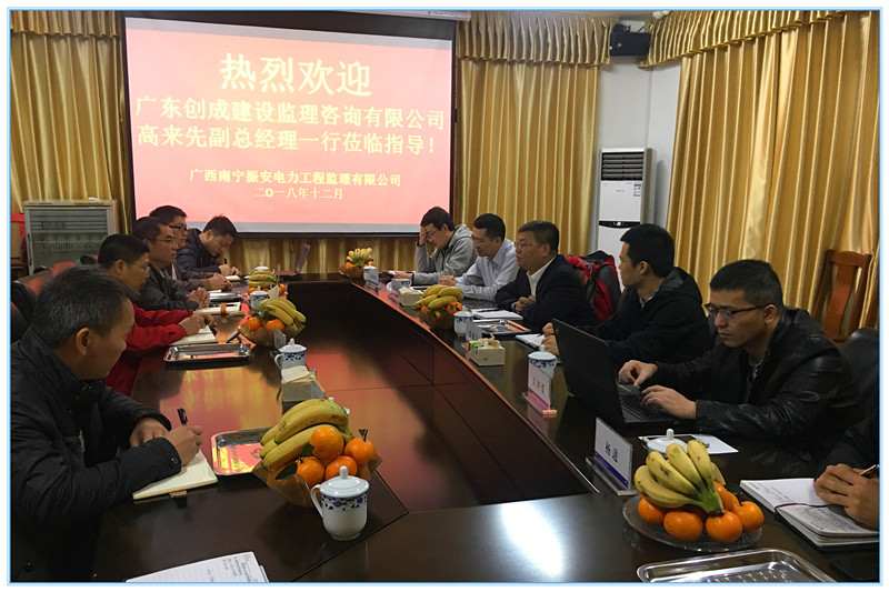 2018年12月27日上午,广东创成建设监理咨询有限公司高副总经理率领经营部、咨询部等领导一行6人到我公司指导及交流。公司执行董事肖立新、总经理方童生亲自接待,双方在公司二楼会议室进行座谈交流,公司工程部主任岑创林、经营部主任黄超星、工程部副主任吴教新、综合部主管奚邦宇、总监理工程师梁运杰参加了座谈交流。