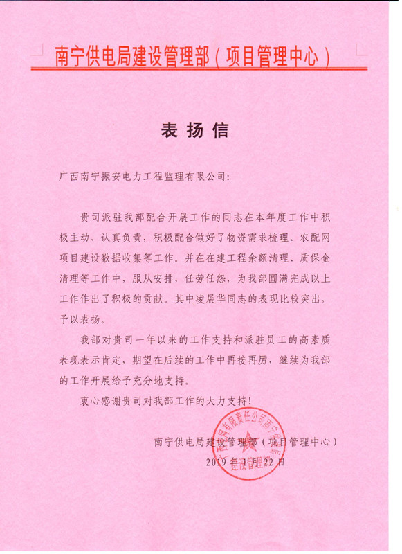 公司自成立以来,一直积极主动为业主服务,在项目建设过程中充分发挥监理作用。2019年1月22日,公司喜获南宁供电局建设管理部(项目管理中心)的表扬信,业主在信中充分肯定了我振安公司派驻员工的工作,高度赞扬了派驻员工工作积极主动、认真负责,积极配合完成物资需求梳理、农配网项目建设数据收集等工程,其中尤以凌展华表现尤为突出。派驻员工在工程余额清理、质保金清理等工作中,服从安排、任劳任怨,为工作的圆满完成作出了积极贡献。