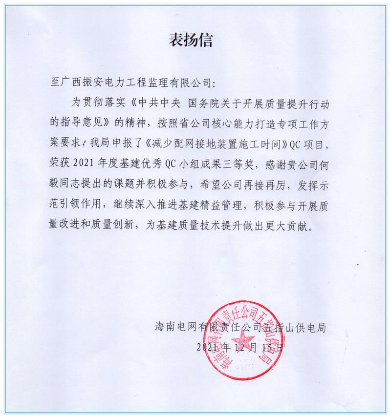 2021年12月07日,在海南电网2021年度基建优秀QC小组成果发布会上,五指山供电局建管QC小组推荐申报的《减少配网接地装置施工时间》QC成果荣获三等奖,得到了专家评委的高度评价和充分肯定。