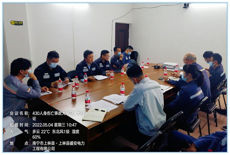 2022年5月5日上林供电局黄副总经理带队组织振安监理、施工单位广西国恒上林分公司管理人员,作业人员深入学习贵州送变电建设公司4.30作业人员高处坠落事故讨论学习会,并复习《广东阳江“3.21”人身死亡事故的通知》《2021年广东阳江供电局“8.18”外施工单位人员高坠一般人身事故快报》,《来宾供电局6.29外包一般人身事故》会上黄副总经理要求管理人员,作业人员针对6.29、8.18、3.21、4.30案例安全事故学习必须深刻透彻人人学习安全知识的氛围,人人提高安全意识,在参建电力施工中达到杜绝各类事故发生,同时检查管理人员、作业人员学习情况以事故案例为主会上面对面提问一问一答形式考核学习成果。