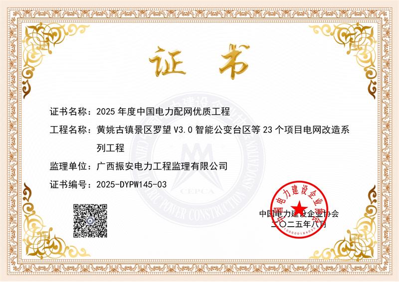 2025年8月9日,中国电力建设企业协会官网公布“2025年度电力优质工程评审结果”(中电建协【2025】203号),公司监理项目:“黄姚供电所罗望村罗望公变台区新建工程”荣获“2025年度中国电力配网优质工程奖”。