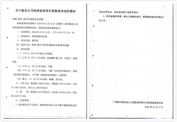 2016年1月11日桂林监理项目部发出《关于振安公司桂林项目部集体活动的通知》,确定了活动时间、活动议程、工作人员以及注意事项。