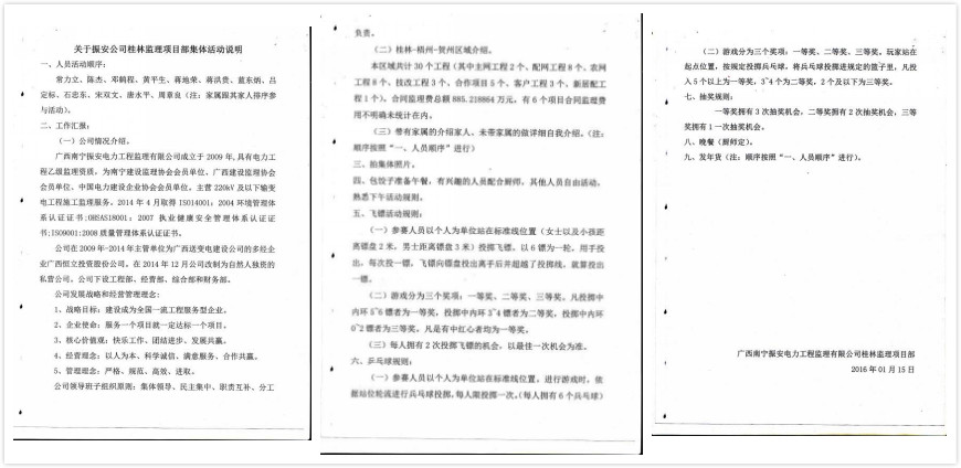 2016年1月15日,桂林监理项目部发出《关于振安公司桂林项目部集体活动说明》,具体说明了活动的内容和规则。