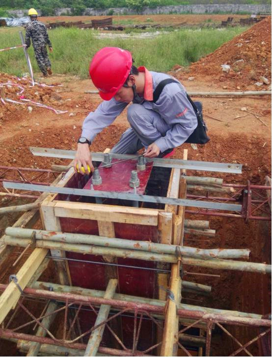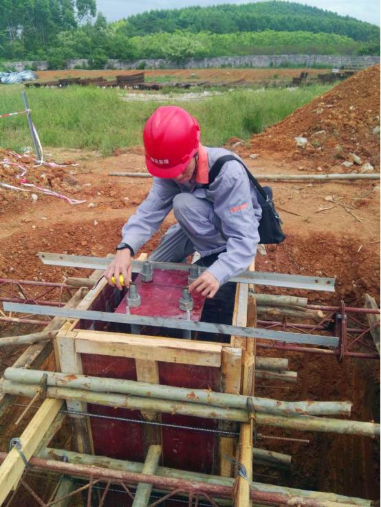 2016年8月15日 现场监理员蓝华昌在龙田T接城关-黄冕110kV线路工程N1基础浇筑前对地脚螺栓尺寸进行核验。