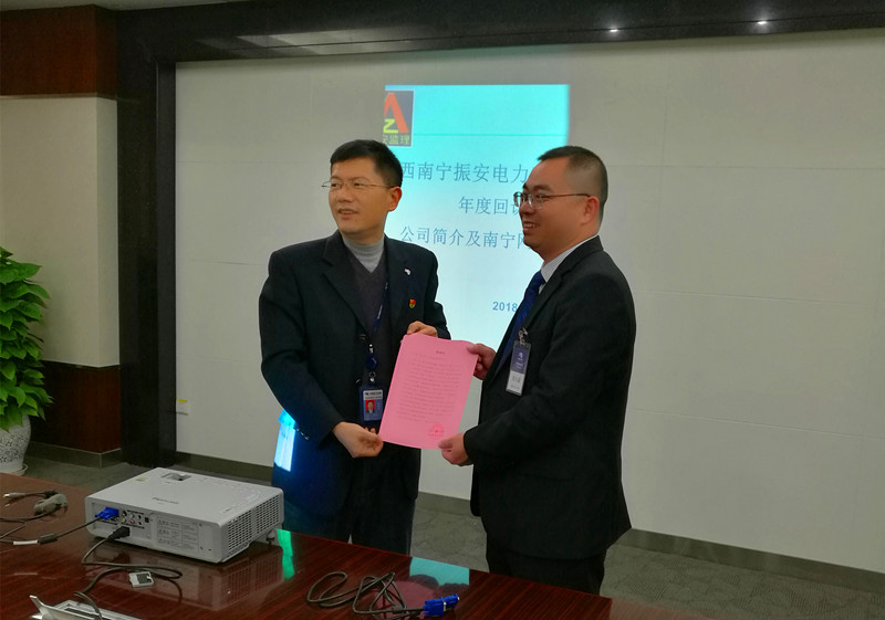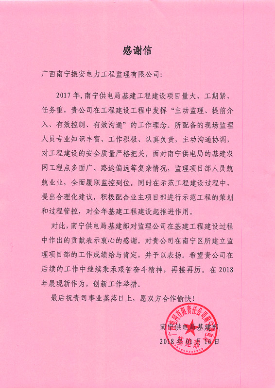 2018年1月26日,公司领导到南宁供电局基建部进行年度业务回访,基建部副主任黄晓立送上感谢信,感谢振安监理公司在基建工程建设过程中发挥“主动监理、提前介入、有效控制、有效沟通”的工作理念,对我公司在南宁区所建立监理项目部的工作成绩给予肯定,并予以表扬。希望我公司在后续工作中继续秉承艰苦奋斗精神,再接再厉。在2018年展现新作为,创新工作举措。