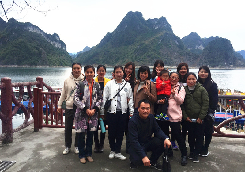 3月8日一早,女员工们踏着初春的清风,首先来到有“中国的下龙湾”美誉的上林县大龙湖景区乘船游览,这里既有桂林漓江少女般的清秀迷人,又有越南下龙湾美男子般的伟岸气势。即便是阴天也别有一番韵味,水雾较大,连绵的石山让人感觉若有若无,隐隐约约,宛如一幅山水国画。